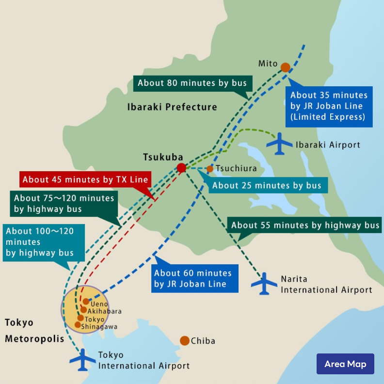 About 60 minutes from Ibaraki Airport by bus bound for "Tsukuba Center".